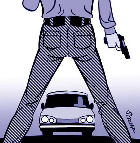 Đúng lúc ấy, một chiếc xe màu trắng từ xa tiến lại, chầm chậm cua vào khúc quanh. Nhìn thấy, mắt tên cướp như lóe lên niềm hy vọng. Không quan tâm đến đội ngũ cảnh sát, tên cướp buông lỏng con tin, tiến ra đường đến chỗ chiếc xe. Đợi lái xe lái gần đến nơi, tên cướp giơ súng chĩa vào lái xe, quát to: