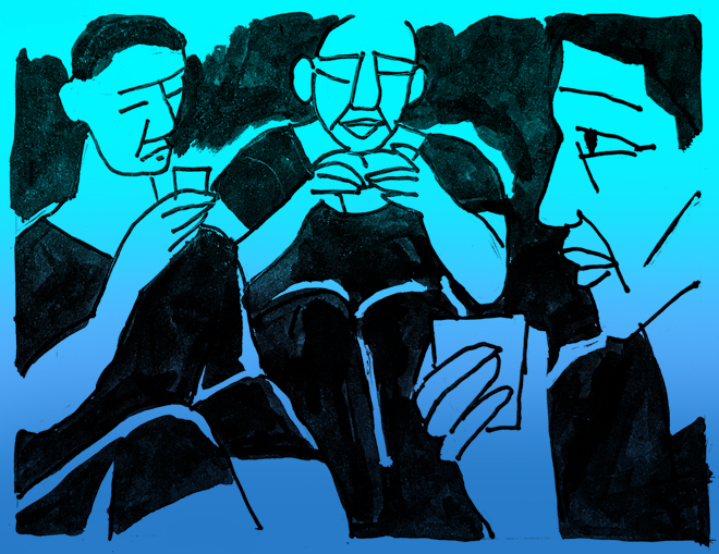 Hai thằng đàn ông với một con đàn bà ra rả, rất chăm chú nghe, rất học trò, "cô giáo" nói gì cũng cúi đầu. Mãi, bản cáo trạng lải nhải rồi cũng hết.