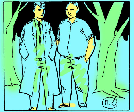 Lew Ssawwitsch đứng dậy khỏi chỗ ngồi của mình, giữ thăng bằng cơ thể, nhón chân len qua những bàn chơi bài, đi qua phòng khách, nơi thanh niên đang khiêu vũ, vừa mỉm cười kẻ cả, vỗ vai một người bán thuốc tây trẻ, gầy còm có họ hàng về đằng nội và lẻn qua cửa nách dẫn vào phòng có tiệc đứng. Trên một cái bàn con hình tròn có các chai rượu vang và các bình đựng rượu mạnh… Bên cạnh chúng, một con cá trích được trang trí bằng hành lá và rau mùi tây bị ăn mất một nửa nằm dưới những thức ăn hấp dẫn khác.