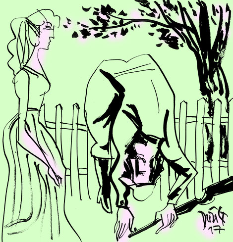 Tôi thận trọng rảo bước về phía đó và thấy mình đã không gặp may. Nếu Nantucket đi theo con đường mòn quen thuộc, hẳn tôi đã nhận ra hắn. Có thể sau khi vượt qua rào chắn cửa rừng hắn đã theo lối mòn khác trở về nhà, vì tôi rất thông thạo địa thế nơi đây. Sự bực bội khiến tôi không màng cẩn trọng nữa… Bỗng tôi đứng sững lại, khi mục kích một bóng người mặc áo khoác xanh thấp thoáng sát hàng rào, bên cạnh là Nantucket gập mình vắt chéo thân thể qua hàng rào, đầu chúi xuống với khuôn mặt biến dạng be bét máu.