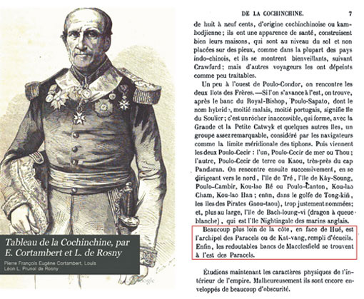 | Sách “Phong cảnh xứ Đàng Trong” (Tableau de la Cochinchine) do E.Cortambert và Léon de Rosny biên soạn, xuất bản tại Paris năm 1862 ghi rõ: "Đối diện với Huế là quần đảo Paracels, tức là Kat-vang (Cát Vàng)". |