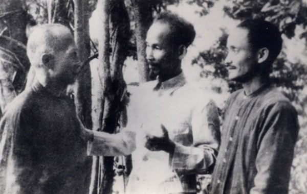 | Chủ tịch Hồ Chí Minh trao đổi công việc với đồng chí Tôn Đức Thắng và Hoàng Quốc Việt tại An toàn khu năm 1947. |