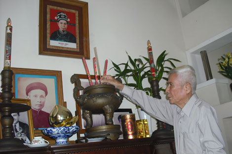 Ông Hoa bên ban thờ Tổng đốc Hoàng Diệu. |
