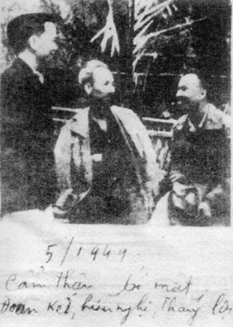 | Bác Hồ căn dặn đồng chí Lê Quảng Ba (bên phải) trước khi lên đường sang Thập Vạn Đại Sơn giúp bạn, với dòng chữ tự tay Người viết: "Cẩn thận, bí mật, đoàn kết, hữu nghị, thắng lợi", ghi tháng 5/1949. Ảnh: Tư liệu |