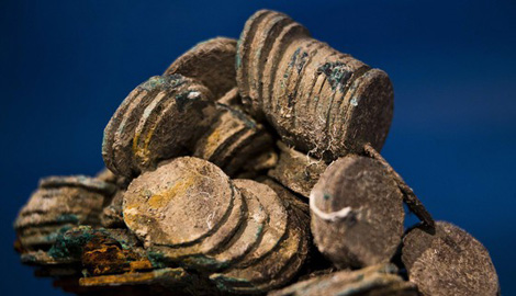 Hàng trăm nghìn đồng tiền xu bằng vàng và bạc được tìm thấy trong xác tàu Nuestra Senora de las Mercedes. Ảnh: AP.