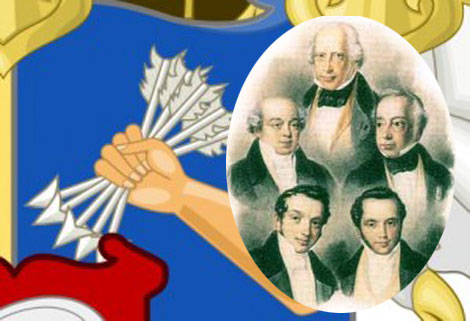 | Năm con trai của Mayer Amschel Rothschild, 5 mũi tên cắm vào 5 trung tâm tài chính Châu Âu. |