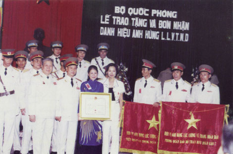 | Bà Minh Vân thay mặt gia đình đón nhận danh hiệu Anh hùng LLVTND của liệt sĩ Đào Phúc Lộc, tại Hà Nội năm 1998. |