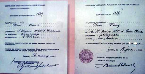 | Thị thực cho phép nhập cảnh vào nước Nga, số 1829, ngày 16-6-1923 của đại diện Liên bang CHXHCN Xô Viết tại Béc-lin, Đức cấp cho Cheng Vang (Nguyễn Ái Quốc) |