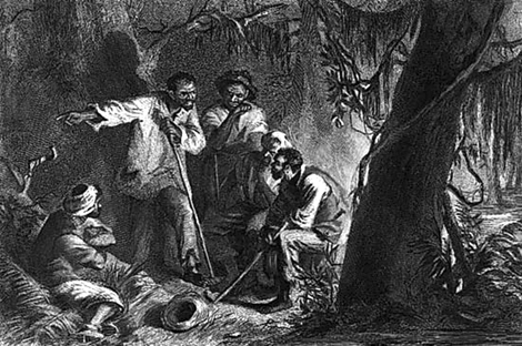 Hàng ngày, họ chỉ dám nấu ăn vào buổi sáng sớm để khói bếp lẫn với sương mù còn ban đêm, họ nằm co quắp trong các hốc cây. Những lần nghe tiếng chó sủa, tiếng nước khua động bởi các mái chèo của các đội tình nguyện viên săn lùng họ từ xa vọng lại, cả bọn nằm im như chết. Nô lệ Collins kể tiếp: "Có khi cả 2 tuần lễ mà không thấy người tiếp tế, chúng tôi phải ăn rêu nấu với mấy con rùa bắt được…".