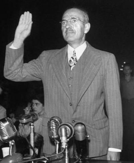 Harry Dexter White tuyên thệ trước Ủy ban HUAC tại phiên điều trần. |