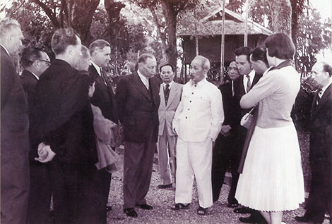 Chủ tịch Hồ Chí Minh nói chuyện với Đoàn đại biểu Quốc hội Tiệp Khắc bên ngôi nhà sàn trong khu Phủ Chủ tịch, tháng 2-1960.