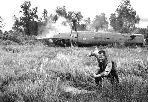 | Một lính Mỹ tháo chạy khỏi chiếc trực thăng bị bắn rơi ở Ấp Bắc. |