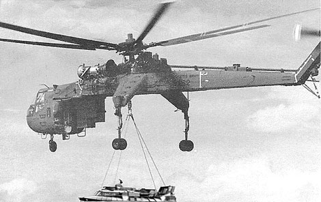 | Trực thăng CH54 cẩu xuồng bay đến khu vực hành quân. |