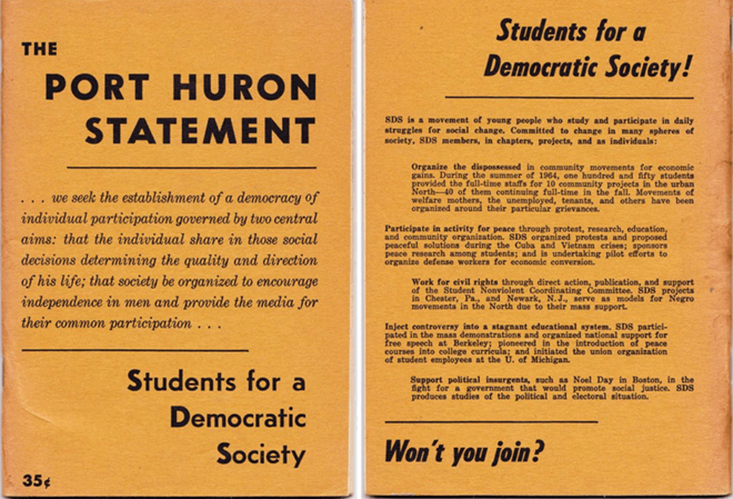 Bản tuyên ngôn dài 64 trang kêu gọi cơ hội bình đẳng cho tất cả - và tố cáo những kẻ đạo đức giả trong hệ thống chính trị Mỹ lúc bấy giờ. Những dòng mở đầu của Tuyên bố Port Hureon có đoạn: "Chúng tôi là những người thuộc thế hệ này, được nuôi dưỡng trong một sự thoải mái nào đó, học tập trong các trường đại học, nhưng cảm thấy bất an về thế giới mà chúng tôi sẽ kế thừa". Khoảng 60.000 bản sao của văn kiện đã được phân phát với giá 25 xu/bản. Hayden thậm chí còn đích thân giao một bản đến Nhà Trắng, nơi Tổng thống Kennedy đang cầm quyền.