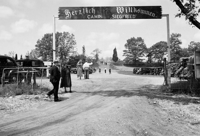 | Bức ảnh đề ngày 22 tháng 5 năm 1938, được cung cấp bởi Cơ quan lưu trữ thành phố New York trưng hình ảnh cổng trước của trại Siegfried ở Yaphank (New York). |