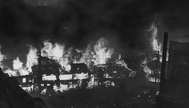 | Các tòa nhà bốc cháy sau cuộc không kích bằng bom cháy. |