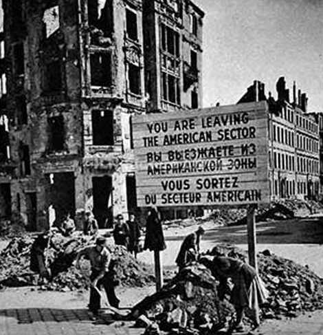 Phần phía đông của nước Đức thuộc về Liên Xô, trong khi phần phía tây thuộc về Mỹ, Anh và Pháp. Dù thủ đô Berlin và vùng phụ cận nằm hoàn toàn trong vùng Liên Xô kiểm soát (cách ranh giới giữa các vùng cai quản đông và tây hơn 160 km), các hiệp định Yalta và Potsdam cũng chia thành phố thành những phần tương tự: Liên Xô cai quản nửa phía đông, còn các nước Đồng minh khác kiểm soát phần phía tây.