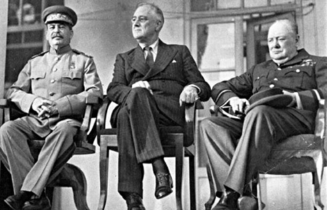 | Các ông Vissarionovich Stalin, Franklin D. Roosevelt và Winston Churchill tại Hội nghị Teheran 1943. |