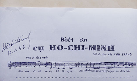| Văn bản bài hát của nhạc sĩ Lưu Bách Thụ có chữ ký của Hồ Chủ tịch. |