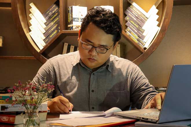 | John Nguyễn đang hoàn thiện bản thảo kịch bản. |