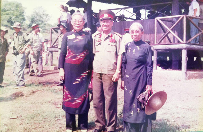 Thượng tướng Trần Văn Trà (đứng giữa) về thăm lại chiến khu Lộc Ninh ở miền Đông Nam Bộ sau ngày đất nước thống nhất.