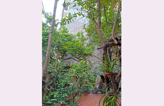Đứng kiên định trên hàng rào sắt là cây xương rồng, hoa màu lửa - kỷ niệm của ông cậu vợ đã khuất. Nàng mang nó về từ Móng Cái miền biên viễn xa xôi. Bao quanh cây bưởi là bụi hoa lan kiếm của cố nhà văn Dương Duy Ngữ. Bụi hoa mọc trên tường cao, anh phăng phăng bắc thang lên bê tất cả xuống, trao tay tôi, bảo: