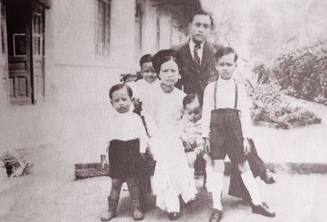 | Vĩnh Bảo (hàng đầu, thứ 3 từ trái qua) cùng cha, mẹ và 3 anh thuở nhỏ. |