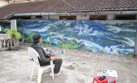 | Họa sĩ Đặng Tin Tưởng tại xưởng họa được ông thuê ở Sa Pa. |
