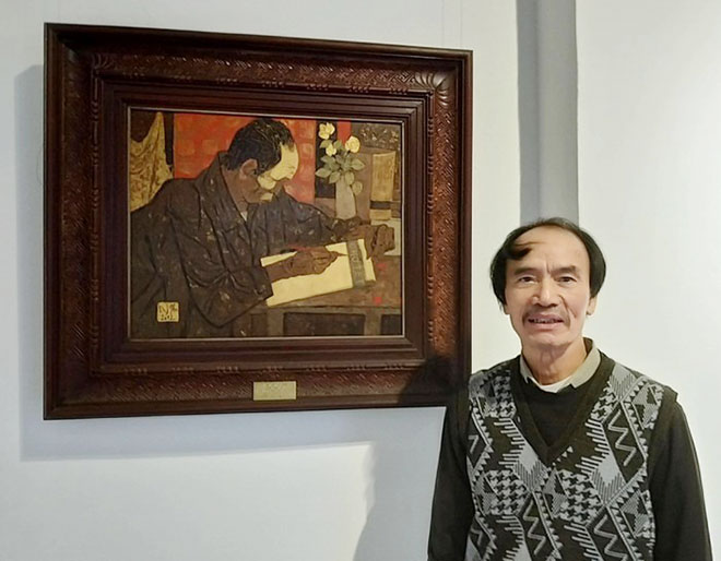 | Họa sỹ, nhà giáo Ưu tú Đoàn Văn Nguyên bên bức tranh "Nhà thơ thôn ca Đoàn Văn Cừ”. |