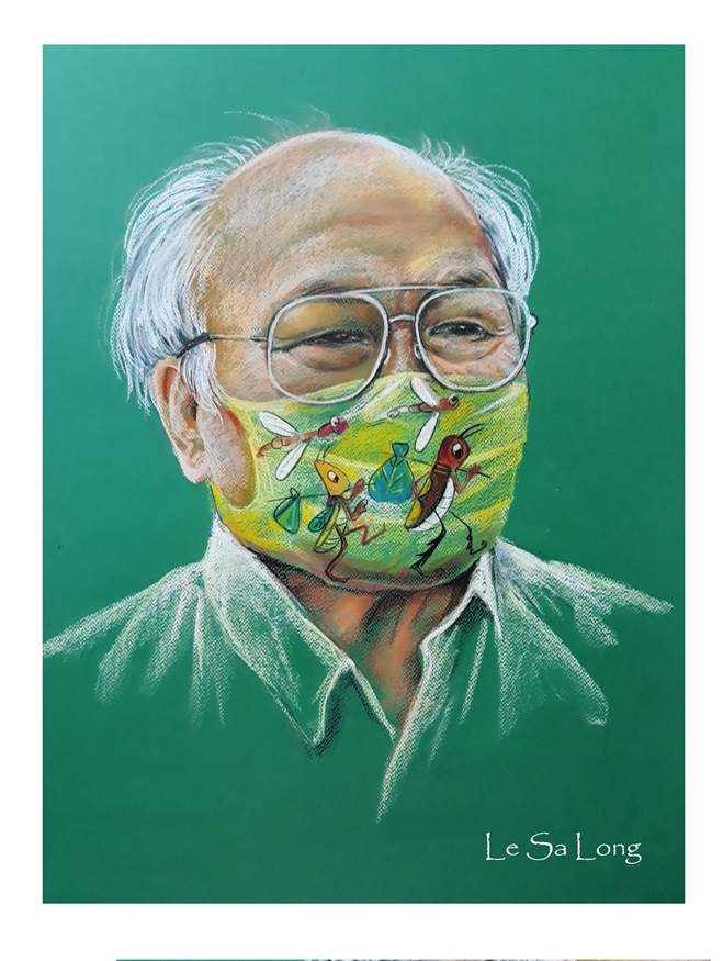 Đỉnh điểm họa sĩ Lê Sa Long hoàn thành bộ tranh "Khẩu trang và người nổi tiếng" là tháng 9 năm 2020. Đây cũng là tháng diễn ra kỷ niệm 100 năm sinh nhà văn lớn Tô Hoài. Và trên chiếc khẩu trang chân dung ông đương nhiên là những chú dế mèn trong tác phẩm nổi tiếng "Dế mèn phiêu lưu ký". Với nhà văn, nghệ sĩ Mạc Can thì chiếc khẩu trang mỏng mảnh màu trắng pha hồng của con người đa năng, lụy tình, ẩn hiện bộ râu bạc hóm hỉnh.