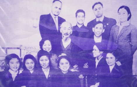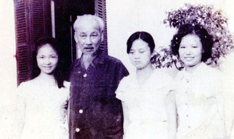 | Tiến sĩ Đặng Việt Nga (trái) và các bạn chụp ảnh với Bác Hồ. |