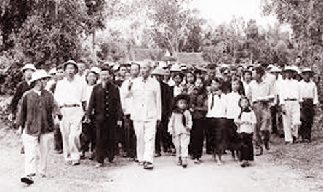 Về thăm quê, dù đã cách xa mấy chục năm, Bác vẫn lần theo lối quen ngày trước và Người ngồi lặng đi trên chiếc chõng tre ngày xưa. Bây giờ đứng trong khung cảnh đơn sơ ngôi nhà tranh của Bác ở làng Sen tôi mới hiểu vì sao ở lối đi vào ngôi nhà sàn ngoài thủ đô, Bác lại cho trồng những rặng hoa dâm bụt. Những cánh hoa đỏ nhị vàng xòe ra trong nắng sớm dập dờn, mỏng manh như những cánh bướm.