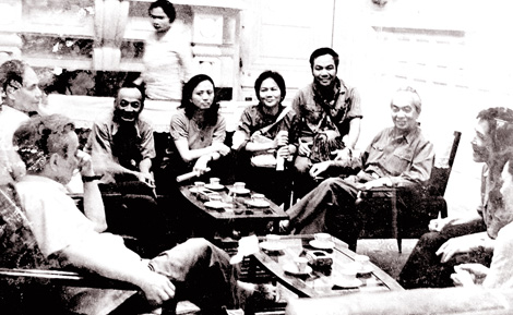 | Đại tướng Võ Nguyên Giáp trò chuyện thân mật với các nghệ sĩ trước giờ công diễn vở "Bài ca Điện Biên". (NSND Đoàn Dũng ngồi bên cạnh Đại tướng, bên trái). (Ảnh do nhân vật cung cấp). |