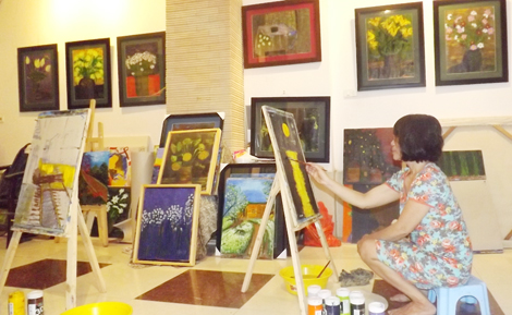 | Nhà thơ Giáng Vân đang vẽ tranh. |