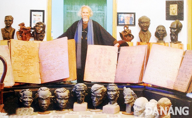 | Nhà điêu khắc Phạm Văn Hạng với bộ thơ khắc đồng và tượng trong bảo tàng vườn Yên Thế - Đà Lạt. |