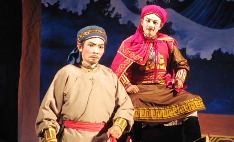 | NSND Minh Ngọc (phải) trong vai Nguyễn Huệ vở “Đêm sáng phương Nam”. |