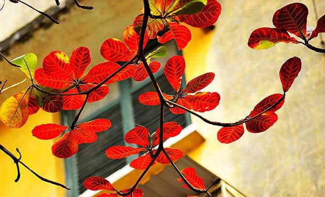 | Lá bàng vào thu đỏ ối trên sân trường. |