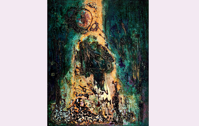 | Một tác phẩm trong bộ tranh “Hóa thân” - sơn mài trên vải Bố. |