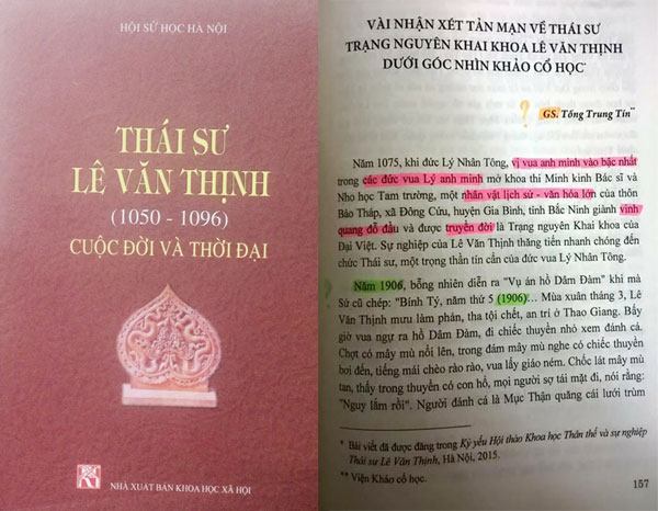 PGS Tống Trung Tín (Viện Khảo cổ học) trong bài "Vài nhận xét tản mạn về Thái sư Trạng nguyên khai khoa Lê Văn Thịnh dưới góc nhìn khảo cổ học", nếu lọc bỏ những mỹ từ mang tính văn học như "vị vua anh minh vào bậc nhất", "nhân vật lịch sử văn hóa lớn", "vinh quang đỗ đầu" thì những lập luận về sử liệu lại khá xộc xệch, lỏng lẻo, suy diễn.