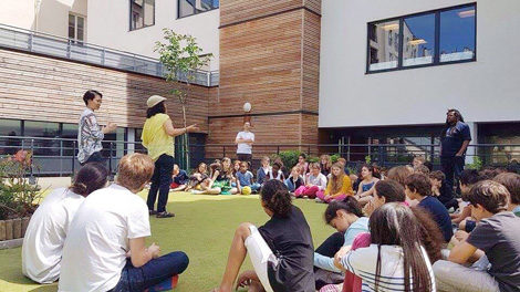 | Nhà văn Y Ban đang đọc thơ cho các em nhỏ trường tiểu học ở Pháp. |