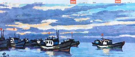 | Tác phẩm “Buổi sáng trên biển Mỹ Khê”. Tác giả Phạm Luận. Bột màu trên giấy báo Nhân Dân hằng tháng số 218, tháng 6- 2015. |