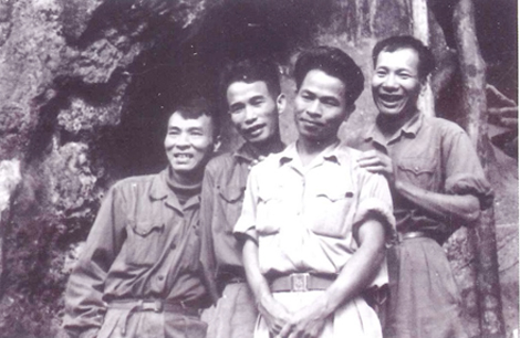 | Tác giả (thứ hai từ phải qua) cùng tướng Lê Đình Sô và các sĩ quan ở cửa hang H1 - Sở Chỉ huy Mặt trận B5. |