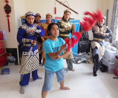 | Nghệ sĩ Bạch Long hướng dẫn học viên múa rối ngựa. |