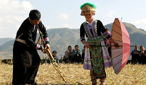 Rồi ông chuyển tay trái cầm khèn nhẩy, giơ lòng bàn chân phải co về phía sau cho chạm khèn vào chân. Thấy vậy tôi thầm ước: "Giá mà lúc này có một cô gái Mông váy hoa rực rỡ, hai má đỏ hồng, tay xoay xoay chiếc ô cùng bước vào nhịp múa thì còn gì bằng".