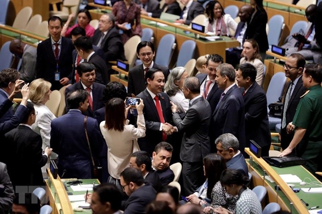 | Bạn bè quốc tế chúc mừng Phái đoàn Việt Nam tại LHQ sau khi Việt Nam trúng cử làm Uỷ viên không thường trực Hội đồng Bảo an LHQ với số phiếu gần như tuyệt đối (192/193). Ảnh: TTXVN. |