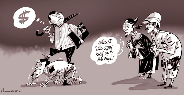 Nhưng suy cho cùng, nhìn lại chữ "quan" mới thấy đau hơn. Trong từ điển, "quan" là một từ chỉ những người có chức phận, làm hầu cho vua. Nhưng quan hiện đại thì không hầu cho dân mà thay vào đó, họ "dần dân" cho thỏa cái đặc quyền nhỏ bé mà mình may mắn chiếm được trong đời.
