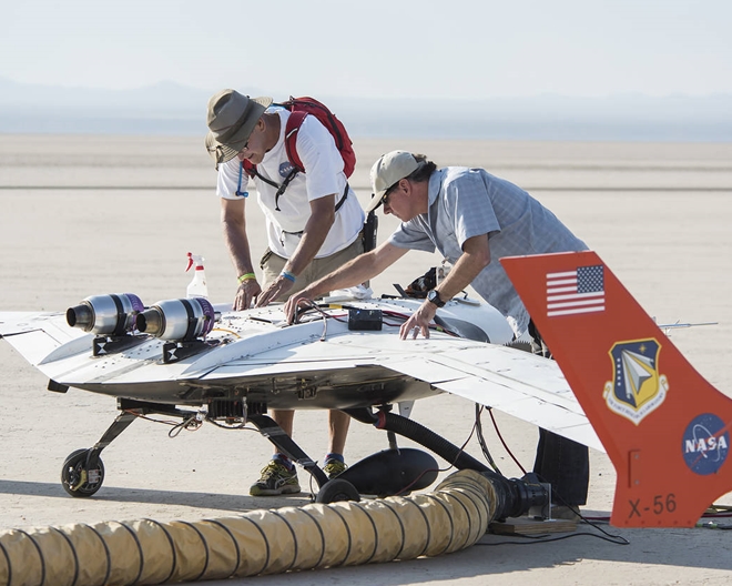 Máy bay trên có tên X-56A do Cơ quan không gian Hoa Kỳ và hãng Lockheed Martin sản xuất và đang bay thử nghiệm. Chiếc máy bay nặng 90 pound ( 1p=0,45 kg) đã bay tới độ cao 4.000 feet (( 1f=30,48 cm) và tốc độ 70 hải lý (1 H=1,8 km)/ giờ.