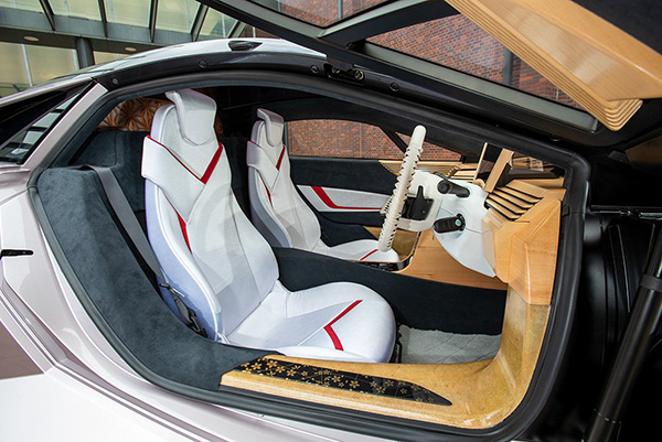 Mẫu xe ý tưởng này cũng có thiết kế cửa hình cánh bướm, bánh xe đa chấu, cũng như một bộ khuếch tán lớn. Bên trong, các tấm Nano Cellulose cũng được ốp gỗ và vô lăng hai chấu với lẫy chuyển số.