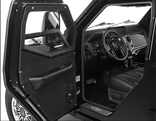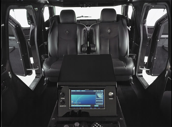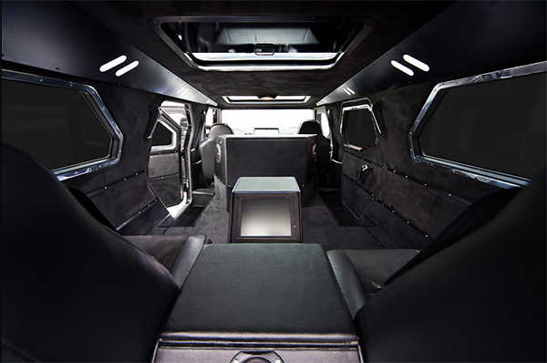 Knight XV có thể được trang bị kính chống đạn trong suốt hoặc mờ đục. Lớp kính đặc biệt được làm từ vật liệu tổng hợp. Tuy vẻ ngoài hầm hố nhưng không gian nội thất của nó sang trọng như một phòng khách sạn năm sao. Những tính năng đi kèm đáng chú ý bao gồm truyền hình vệ tinh, hệ thống làm mát, ghế có sưởi, một hộp đen và trung tâm giải trí đa phương tiện.