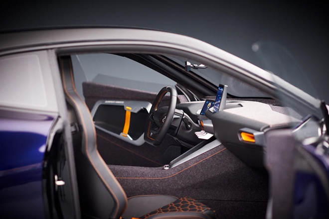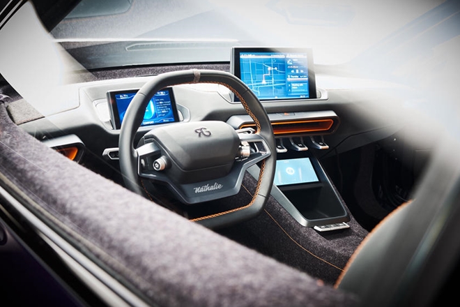 Bên trong, nội thất của RG Nathalie được thiết kế tối giản nhưng vẫn đầy tính thể thao và hiện đại, nổi bật là hai màn hình cảm ứng ở trung tâm bảng điều khiển và một màn hình thông tin phía sau vô-lăng thay thế đồng hồ analog truyền thống. Xe nặng chưa tới 1,6 tấn, với tỷ lệ phân bổ trọng lượng trước/sau là 45:55.